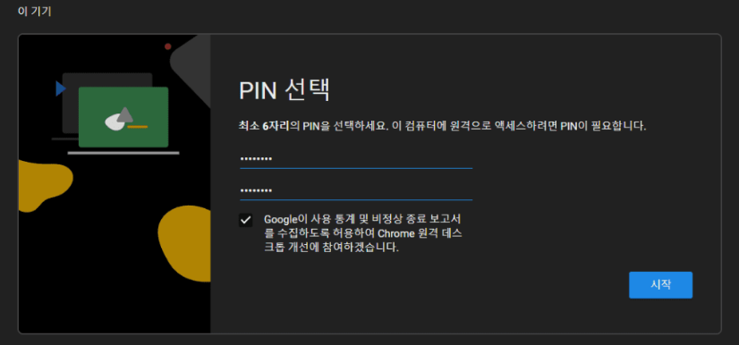 이후부터는 크롬 원격 데스크톱 연결 가능한 컴퓨터 목록을 보고 원하는 기기를 선택 후, 설정했던 PIN 번호를 입력해 시작하면 되는데요.