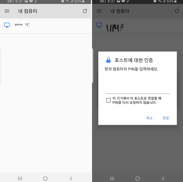 로그인 후에는 등록된 원격 컴퓨터를 선택할 수 있는 화면을 볼 수 있고, 마찬가지로 PIN 번호를 입력하면 원격 제어가 가능해지는 구조인데요.