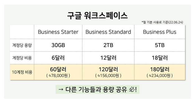 30GB 스토리지만으로도 기본 업무는 충분히 처리되는 만큼, 초기 비용 부담 없이 시작하기 좋은 요금제입니다.